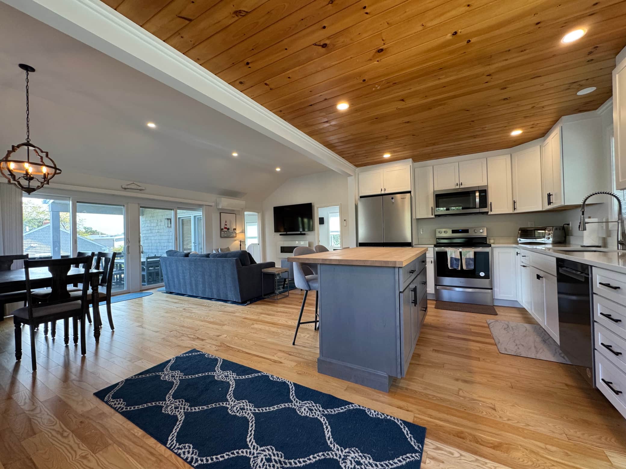 The entire home is thoughtfully designed on a single level, making it incredibly accessible and easy to move between the indoor and outdoor spaces. Inside, the bright open-concept living area features a stunning wood-paneled ceiling and a modern gourmet kitchen with stainless steel appliances and a large island for gathering. Whether you are hosting a family dinner at the farmhouse table or relaxing in the living room by the fireplace, the seamless flow of the ranch-style floor plan ensures everyone stays connected.